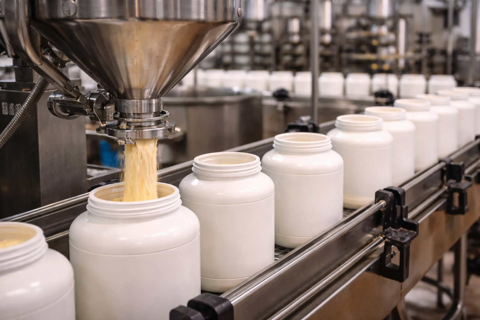 Fresh milk collected from farms undergoes purification and pasteurization to maintain safety and preserve essential nutrients required for protein production.